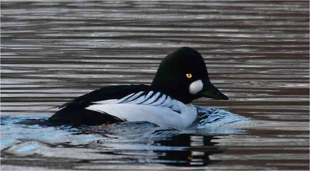 Focus off the badly focused montage of tripe I had accumulated over the weekend, I had something to live for. I rushed as fast as my sore knees would take me, ignoring the large amount of nothing going on on the flats, just in time to see a group of duck with Goldeneye in them fly off westward. Arse! Maybe they would pitch down on Heronry or Shoulder of Mutton, I said to Bob, who had also seen crippling views of high speed saw-tooths over his head. Jono flashed by on his bike (maybe I should get mine fixed) coffee break over. Luckily one male was left on the pond. Not a happy duck, unsettled by joggers and dog walkers. Who ain't?